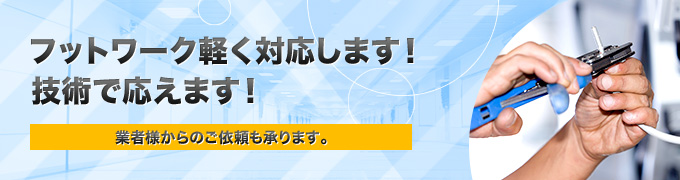 俊英電工は電気工事のプロです。業者様向けにも電気工事を承っております。内線工事をメインとし、幅広く工事をお請けいたします。コンセントやスイッチの増設からオール電化工事など電灯・照明・防災・情報関連設備に関することでしたらお気軽にご相談ください。